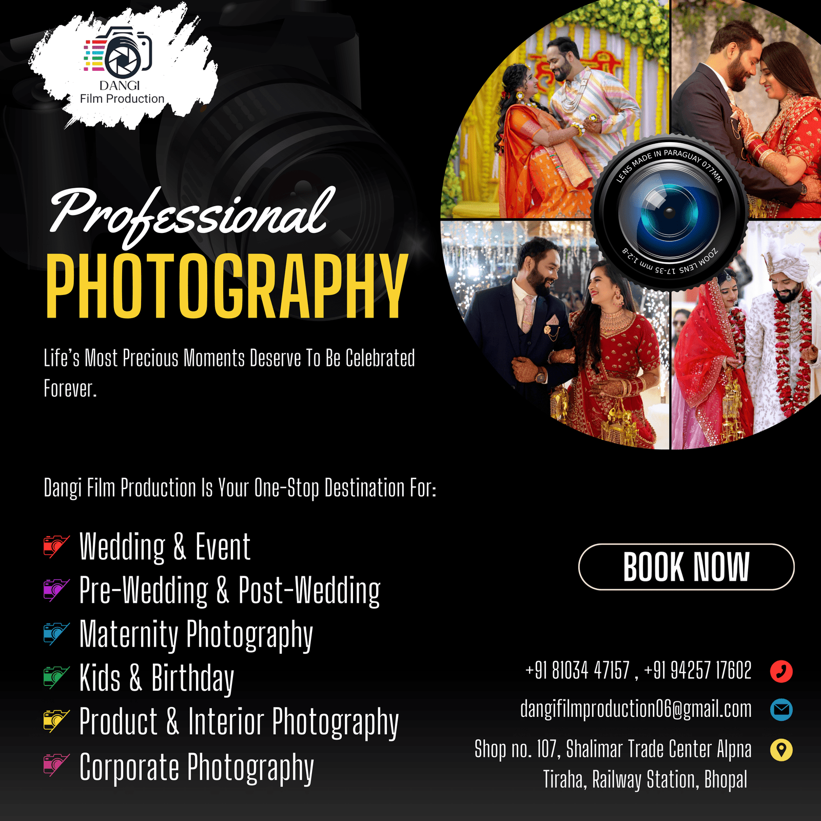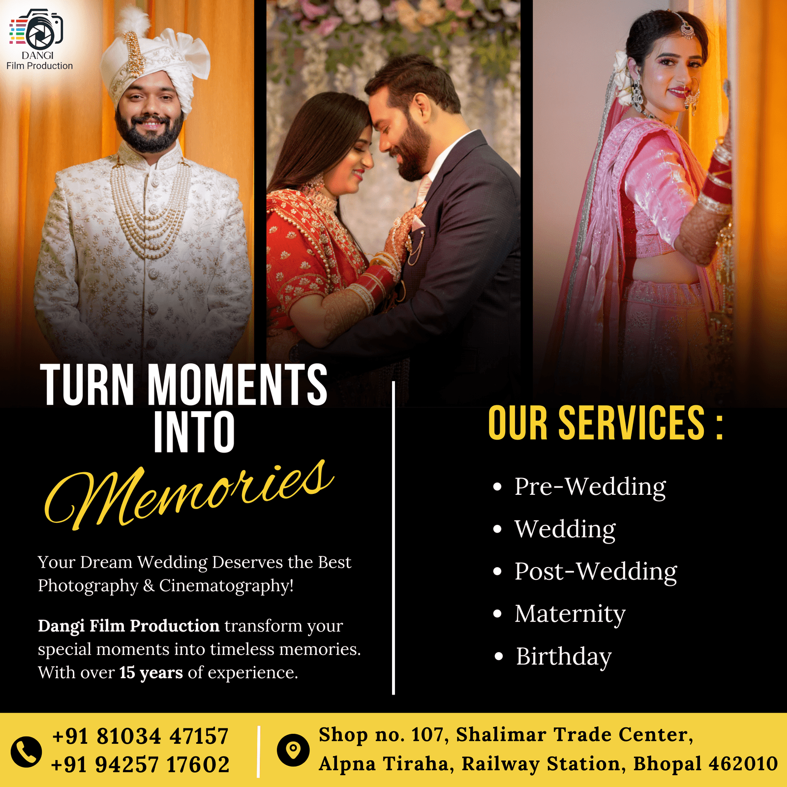 Where we transform every wedding into a timeless memory. Established in 2008 in Bhopal, Madhya Pradesh, our journey has been fueled by a passion for capturing the essence of love and joy. With over 15 years of experience in wedding photography, we have had the privilege of documenting countless beautiful stories, each unique in its own way. At Dangi Film Production, we believe that every couple has a unique story, and it is our mission to narrate that story through stunning visuals.